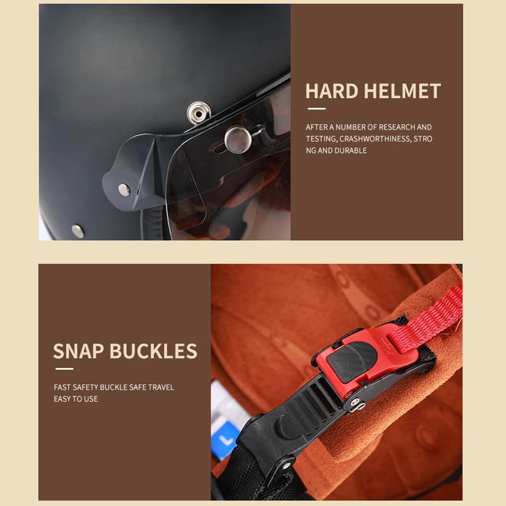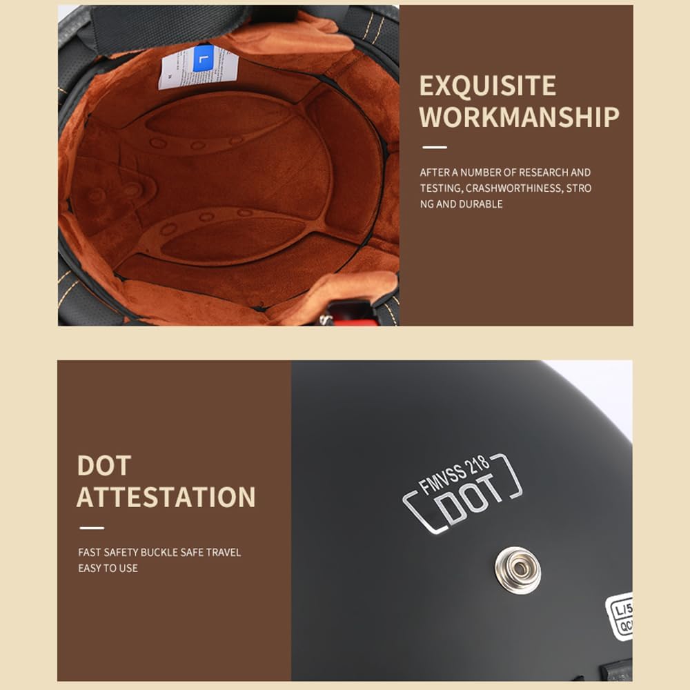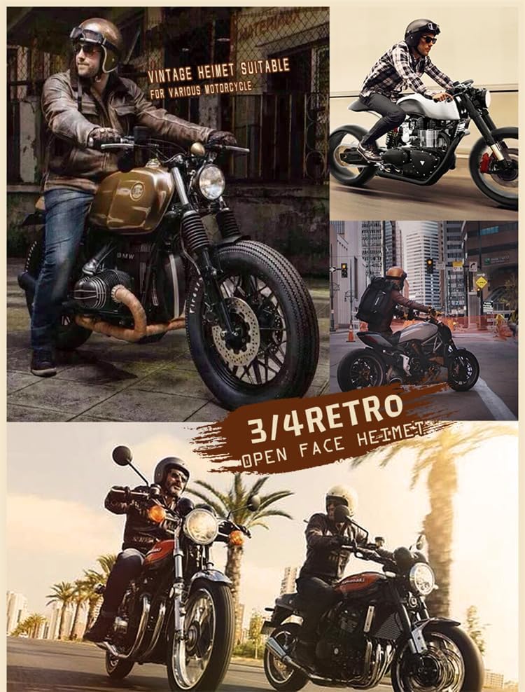 - [Vintage Appeal] GJH 3/4 Open Face Motorcycle Helmet designed with a striking retro look reminiscent of 1950s pilot helmets provides excellent ventilation and a broad field of view perfect for stylish street motorcycles cruisers touring bikes scooters and mopeds